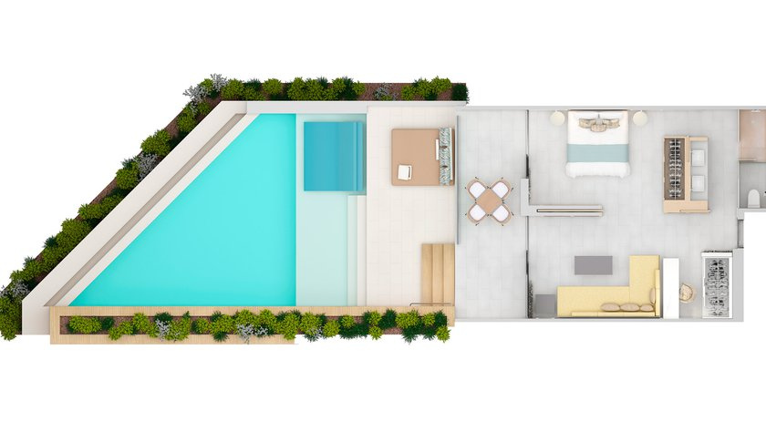 Luxury 121 m2 Suites including a 44 m2 private pool and a large chill out terrace.