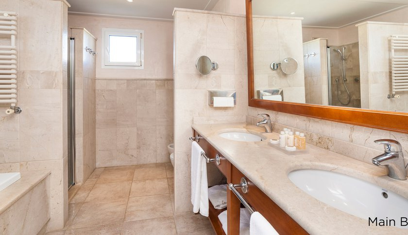 En-suite bathroom with separate hydro massage bathtub and hydro massage shower.